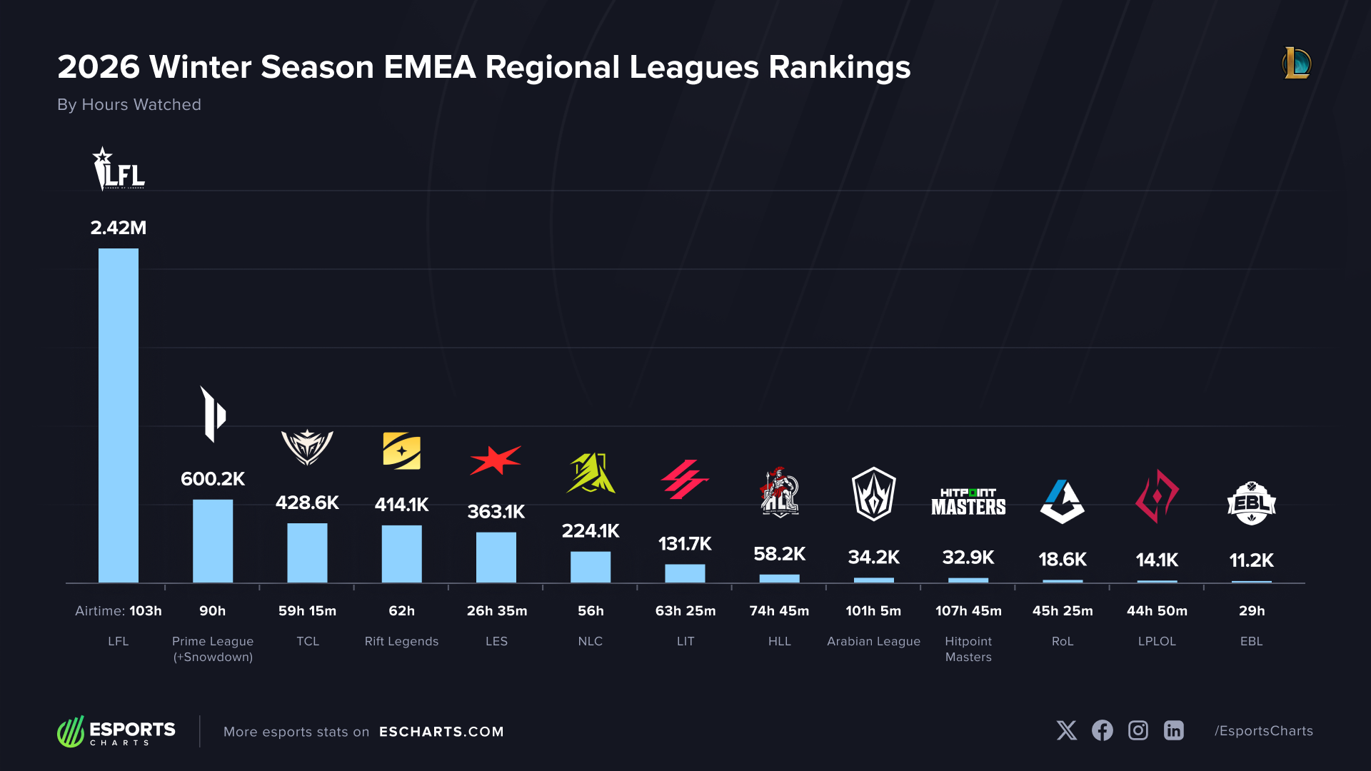 LFL (France): Peak Performance Amidst Absence The French LFL faced a major hurdle: the absence of Karmine Corp Blue, which was busy competing in the LEC Winter Split. While this led to a drop in total watch time, the LFL managed to pull a rabbit out of the hat by increasing its Peak Viewership. It remains the crown jewel of the ERLs, maintaining a hardcore fan base that survives even without its biggest brand.