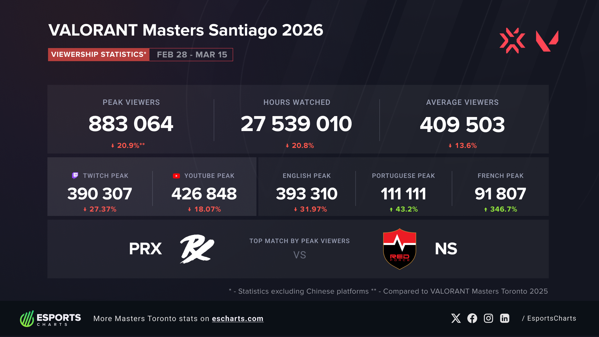 According to Esports Charts, VALORANT Masters Santiago 2026 saw a decline of 15–20% in key metrics compared to the Toronto Masters. Several factors contributed to this “mid-tier” performance: